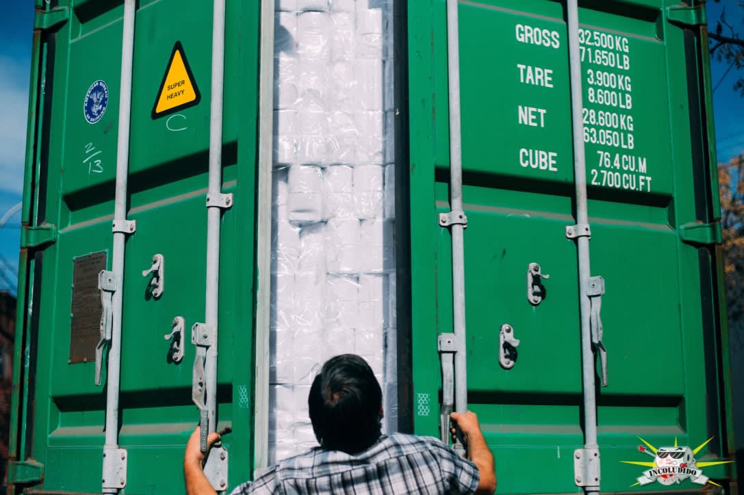 esta foto es clave, es el story telling de Incoludido la llegada del papel higiénico, todo el equipo despues de descargar el camión.